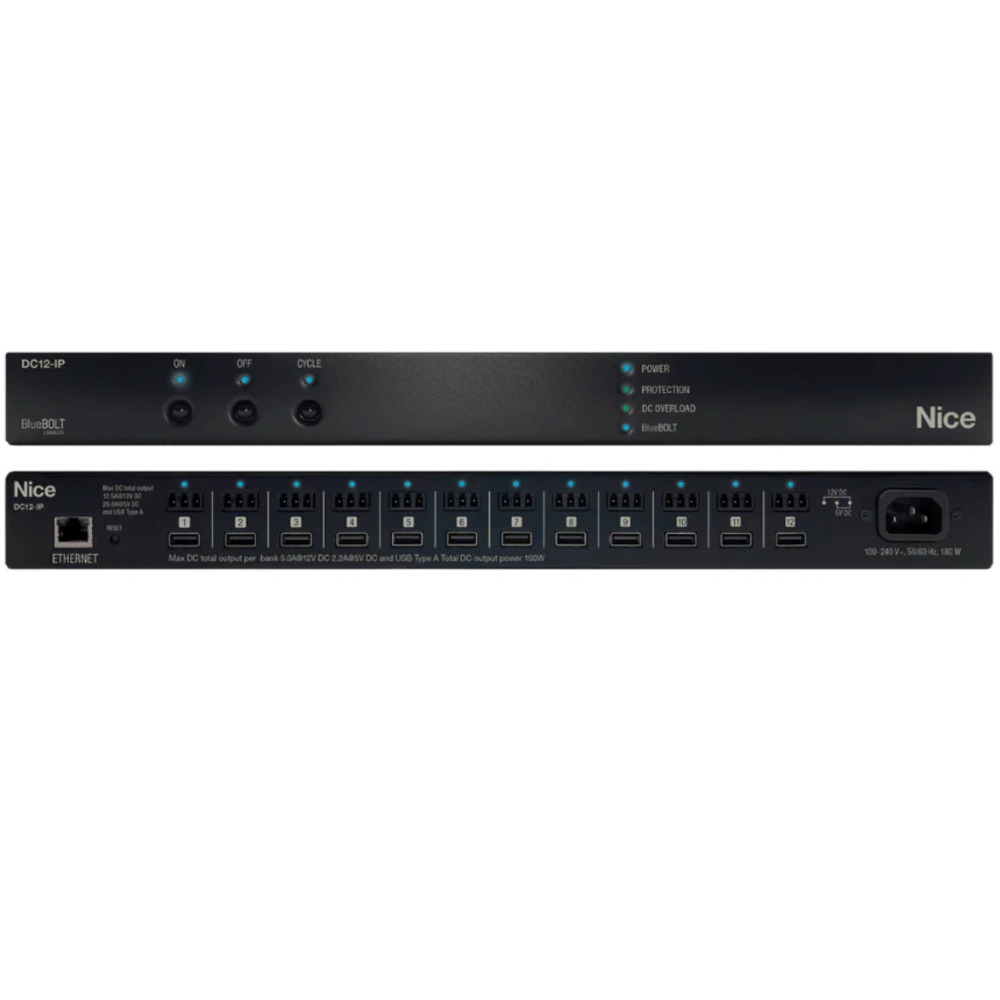 The DC12-IP is a BlueBOLT enabled Smart DC Power Manager with surge protection and filtration built into its highly compact 1RU chassis.